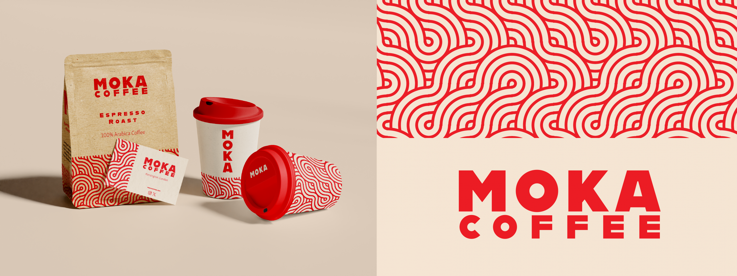 Moka is a bold coffee brand concept built around simplicity, repetition, and strong visual rhythm. The identity explores a modern, graphic approach to coffee branding, combining a confident red-and-cream colour palette with a distinctive, flowing pattern inspired by movement, aroma, and ritual.